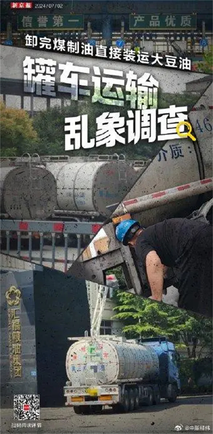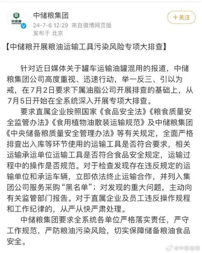 【#媒体评中储粮罐车运输乱象#:食安监管需上“硬杠杠”】针对新京报报道的“运输罐车运完煤制油后未清洗直接混运食用油事件”,7月6日,中储粮集团在其官方微博发布声明称,从7月5日开始在全系统开展专项大排查,对违反相关规定的运输单位和承运车辆依法终止运输合作。媒体发现问题,涉事企业当日即介入,这种自我检视的态度和做法,无疑是对公众关切的积极响应,也有利于其赢得公众的信任。但要想进一步保障好食品安全,显然不能止步于企业自我检视,前置相关监管工作、做好预防把关是更为重要的步骤。接下来,除了食品安全监管要拿出“硬杠杠”、严格落实相关措施外,涉事企业也要举一反三,把食品安全工作始终放在重要位置,主动承担起保障食品安全的社会责任。(综合每日经济新闻、新京报)
