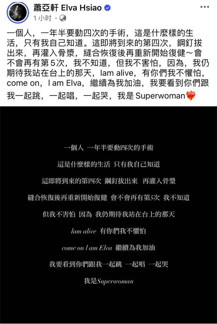 她在文中表示:“一个人,一年半要动四次的手术,这是什么样的生活,只有我自己知道。这即将到来的第四次,钉拔出来再灌入骨浆,缝合恢复后再重新开始复健~会不会再有第5次,我不知道,但我不害怕。因为,我仍期待我站在台上的那天,l am alive(我还活着),有你们我不怕,come on,l am Elva(来吧,我是萧亚轩),继续为我加油,我要看到你们跟我一起跳、一起唱、一起哭,我是Super woman(女超人)。”