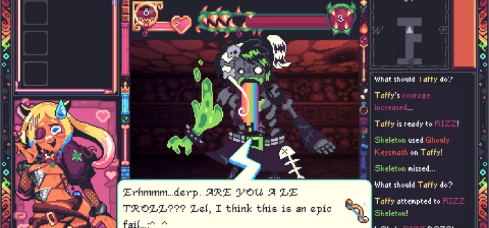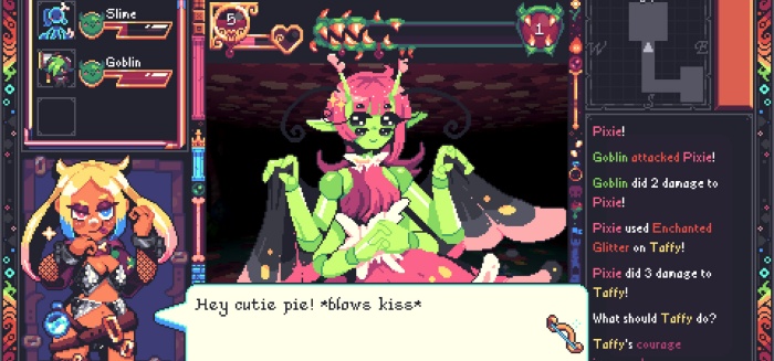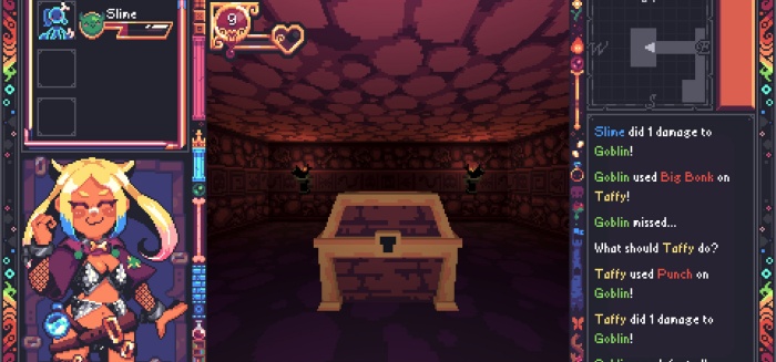 你那邪恶的龙女偷走了你的东西!而且她一路跑到了地牢最底下,尽管她知道你战斗力很弱……唉!别担心!你……呃,实际上你几乎一无是处。一个毫无希望的冒险者该怎么办呢?去找那边那个漂亮的史莱姆女孩帮忙吗?眨眨眼肯定改变不了什么……除非?扮演塔菲,一个无可救药的弱鸡花痴,她一头扎进一个充满个性十足的怪物娘的庞大地牢。建立人际关系,在战斗中生存下来(主要靠她们),并尽量别让你的队友吃醋——或者更糟,别让她们生闷气。