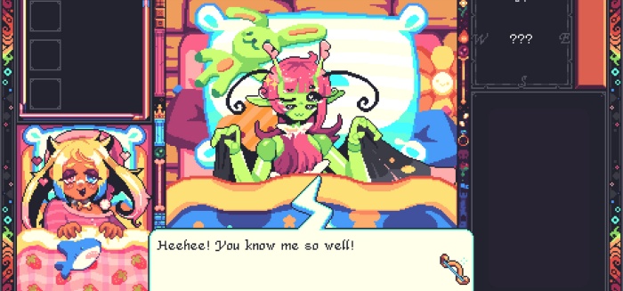 经过一整天的地下城探险,不妨在旅馆里放松身心,享受与心仪的魔物娘共度的宁静时光。在这里,你可以与她聊天、了解她的背景故事,并做出一些意义深远的选择,这些选择将拉近你与她之间的距离……或者,你也可以选择不这样做。一切都取决于你的真心!
