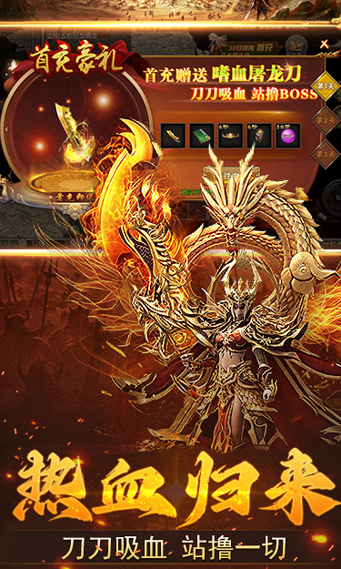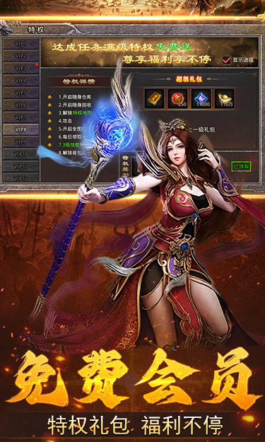 继承了经典传奇的战士、法师和道士三职业设定,复古1.76传奇版本,登录、系统UI、地图等内容进行还原;增加新颖的摆摊玩法,各种特色活动和系统;登录游戏完成任务即可获取VIP特权,领取超值礼包与专属特权效果。使用绑定灵符购买酷炫魂环,免费获得切割伤害、生命上限百分比、怪物伤害抵抗、PK增伤、PK减伤等极品属性;同时可开启专属魂环地图,专属地图高倍装备爆率;免费的快捷一键吸取、自动使用经验元宝等特色功能。游戏内还原经典攻占沙城玩法,新增领土争夺战,跨服夺旗战,竞技盛宴,诸王战场,王者对决,巅峰之战等激情特殊PVP玩法,为玩家打造了酣畅淋漓的热血大陆。