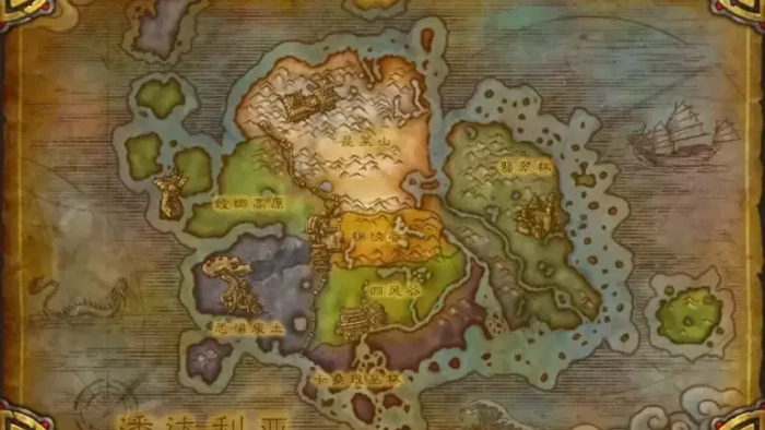 苍翠的新大陆:迷踪岛(1-10级)、翡翠林(85-86级)、四风谷(86-87级)、卡桑琅丛林(86-87级)、昆莱山(87-88级)、螳螂高原(88-89级)、恐惧废土(89-90级)、锦绣谷(90级)。