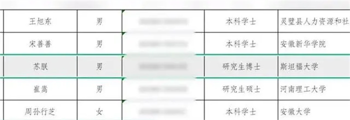 “斯坦福博士苏朕拟录用为灵璧县乡镇机关公务员”引发关注。记者了解到他本科就读中国科大,曾获郭沫若奖学金,高考系全县理科第二。其初高中校友称,他是“学神”一样的存在,高考有点小失误。6月16日晚,安徽省宿州市公务员局通过宿州先锋网发布了宿州市2024年度考试录用公务员拟录用人员公示(第二批)。其中,斯坦福博士苏朕拟录取岗位是灵璧县乡镇机关基层事务管理职位。