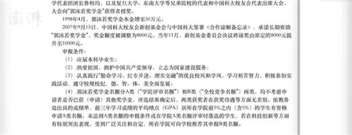 记者在中国科大官网看到,郭沫若奖学金A类申请者需前三年学习成绩的平均绩点(GPA)居所在学院前5%之内(含5%)。未达A类,若在科创等方面有突出表现受广泛关注和肯定,可推荐其申请B类名额。