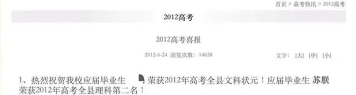 在安徽萧县实验高级中学官网上,记者看到苏朕系2012年高考全县理科第二名。