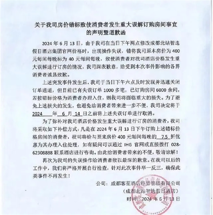 近日,有多名消费者反映,自己40余元预定的成都北站智选假日酒店被强制退单。之后,网传的一份酒店声明称:因工作人员失误将价格设置错误,导致了1000多失误订单,房源达6000余间。酒店称,如果按照错标价格办理入住,将面临极大损失,于是决定取消失误订单。补偿方式为,给出原来房价的7.5折优惠。