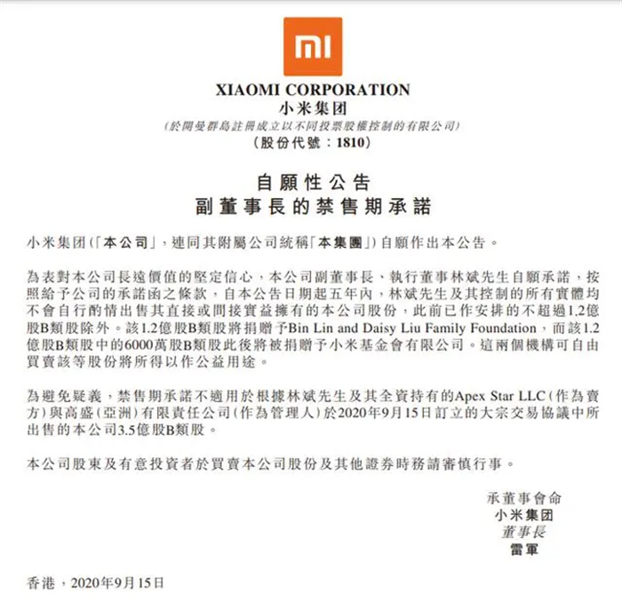 原来,2020年9月15日,小米集团曾发布公告称,林斌自愿承诺,自该公告日期起五年内,林斌及其控制的所有实体均不会自行酌情出售其直接或间接实益拥有的本公司股份,此前已作安排的不超过1.2亿股B类股除外。