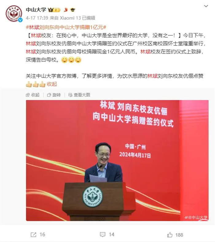 中山大学的官方微博显示,4月17日下午,林斌、刘向东夫妇向中山大学捐赠签约仪式举行,林斌、刘向东夫妇向母校捐赠现金1亿元人民币。