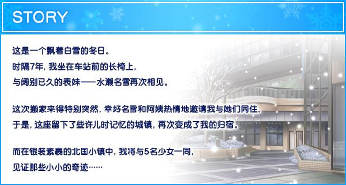 采用最新视觉小说引擎制作的本作,将与您一同走进故事中的北方小镇,拥抱发生在这里的小小奇迹!