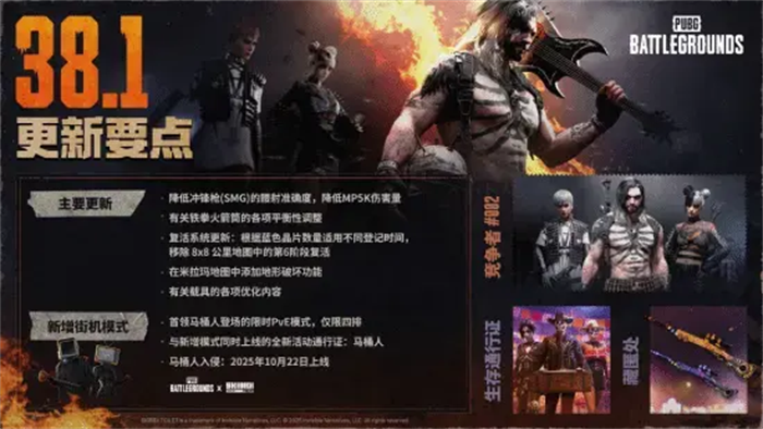 此外,为迎接即将到来的万圣节,《PUBG》将携手全球热门动画IP“马桶人”推出限时联动街机模式。在本次的限时街机模式中,玩家可以以四排的形式与马桶人首领进行PvE首领战。玩家可通过战斗获得“化学罐”,并用其在下一场比赛中升级武器。同时,全新的“活动通行证:马桶人”也将同步上线。该模式将于10月22日在PC平台上线,提供为期两周的限时服务。