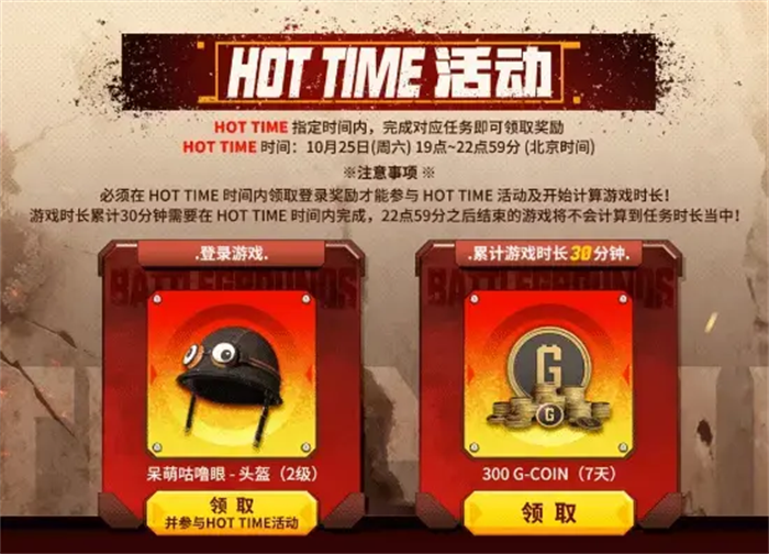 此次活动将在10月25日(周六)19点-22点59分点(北京时间)开启HOTTIME活动,在此时间内容登录游戏可获得首次发布的皮肤呆萌咕噜眼头盔,累计游戏时长30分钟可获得300G-COIN(7天)的奖励,一定不要错过!
