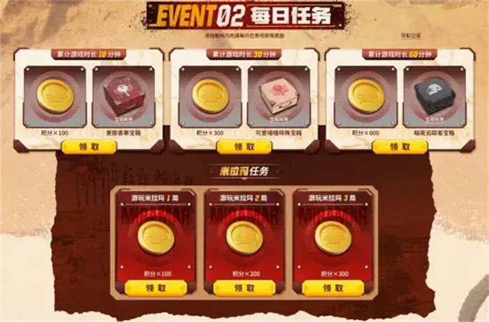活动2:每日任务,活动期间内每日完成游戏时长任务,不仅可以获得大量积分,还有美丽香寒宝箱,可爱喵喵特殊宝箱,暗夜追踪者宝箱可以领取,完成指定的米拉玛任务,还可获得额外的积分奖励;