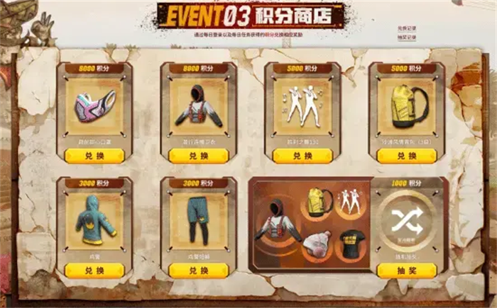 活动3:积分商店,完成每日登录和任务获得的积分可以兑换相应道具奖励,此次有最新发布的皮肤超前甜心口罩,也可以参与随机抽奖,拼手气的时候到了!
