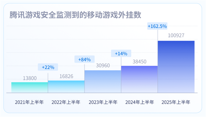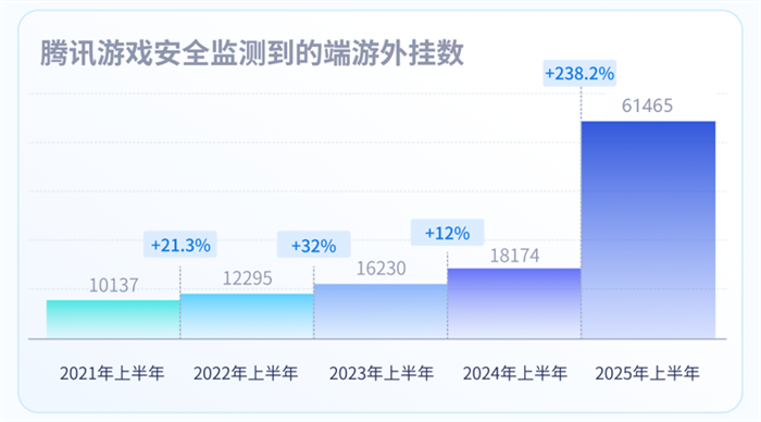 IT之家从报告获悉,2025 年上半年,随着游戏款数和游戏玩家量的增加,游戏黑产愈发活跃,腾讯游戏安全监测到的 PC 端游戏外挂数同比 2024 年上半年,呈现剧增态势,同比增长了 238.2%,达到 61465 款,达到历史之最(以上外挂均在腾讯游戏安全 ACE 监测和打击范围以内)。