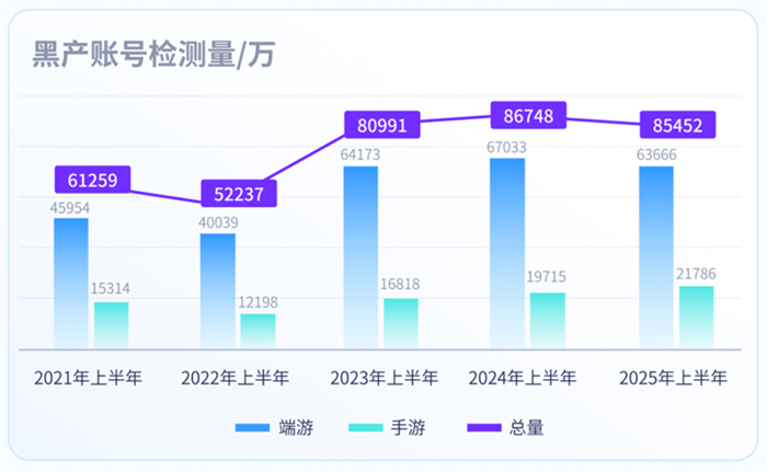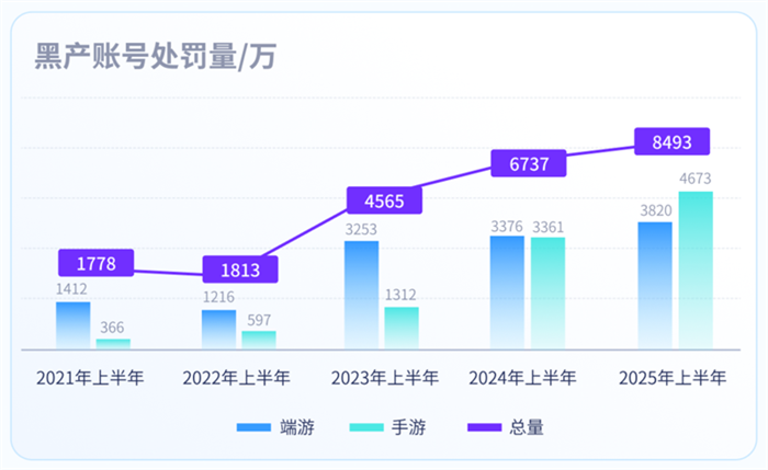 2025 年上半年,腾讯游戏安全处罚的黑产账号量约为 8493 万个,同比 2024 年上半年(6737 万个)上升 20.6%;其中端游黑产账号处罚量同比上升 13%,上升量为 444 万;手游黑产账号处罚量同比上升 39%,上升量为 1312 万。