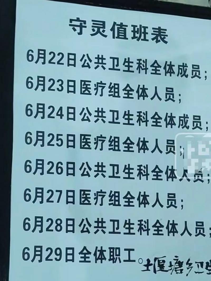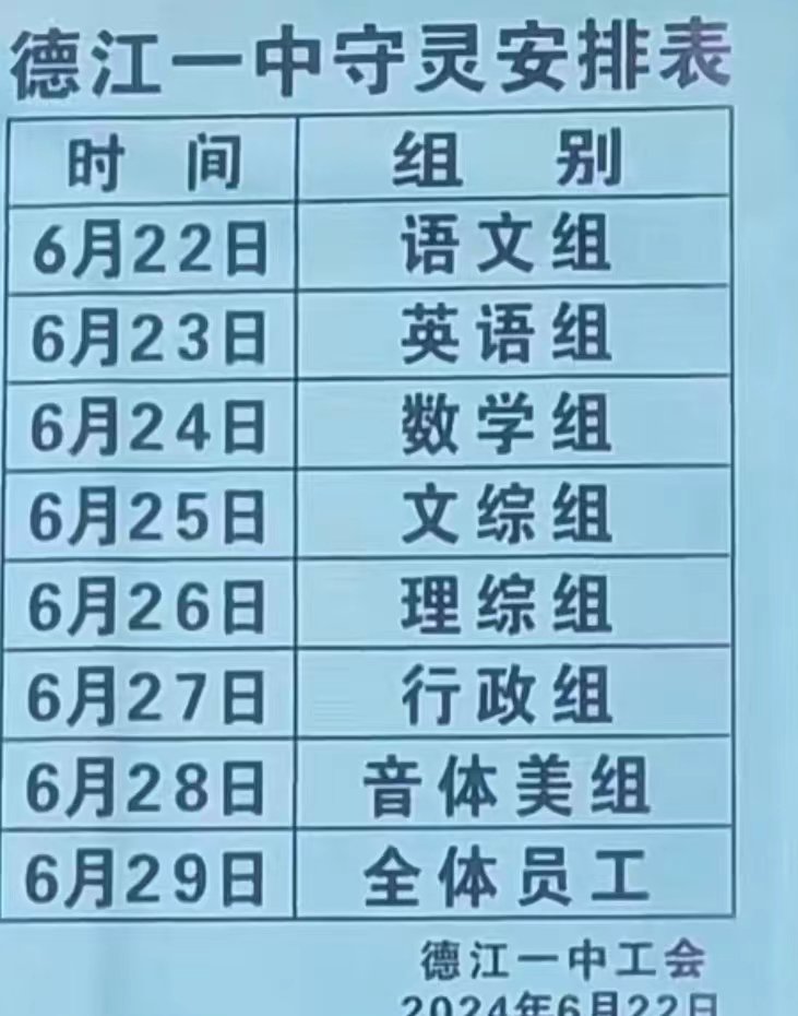 网传照片显示,德江一中工会在6月22日发出守灵安排表,从6月22日至28日,该校每日按教学组安排守灵,包括语文组、英语组、数学组、文综组、理综组、行政组、音体美组,6月29日则全体员工都参加。而堰塘乡卫生院工会发出的守灵值班表的守灵日期也是6月22日至29日,公共卫生科全体成员与医疗组全体人员轮流值班,全体职工在6月29日都参与守灵。