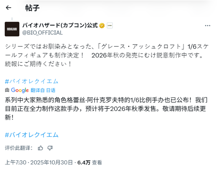 据《生化危机》日本官方账号透露,格蕾丝·阿什克罗夫特的1:6比例实体雕像正在开发中,预计于2026年秋季推出。这一安排被部分业内人士视为卡普空可能采用分阶段发售策略,先推出基础典藏版,后续再发布高端版本。