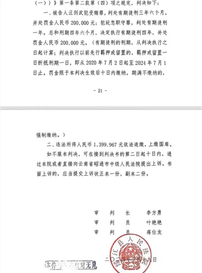 2021年9月13日,昭通市绥江县法院一审宣判,认定汪剑武犯受贿罪、玩忽职守罪,判处有期徒刑七年,并处罚金20万元。