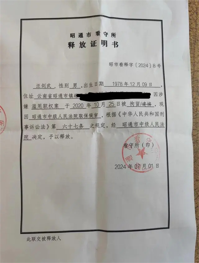 从2020年7月2日被留置到2024年7月1日,汪剑武被羁押满四年。7月1日,重审一审被判四年的汪剑武从昭通市看守所获释,但因本案尚未终结,因此其获释原因为被昭通中院取保候审。目前,该案二审尚未开庭。