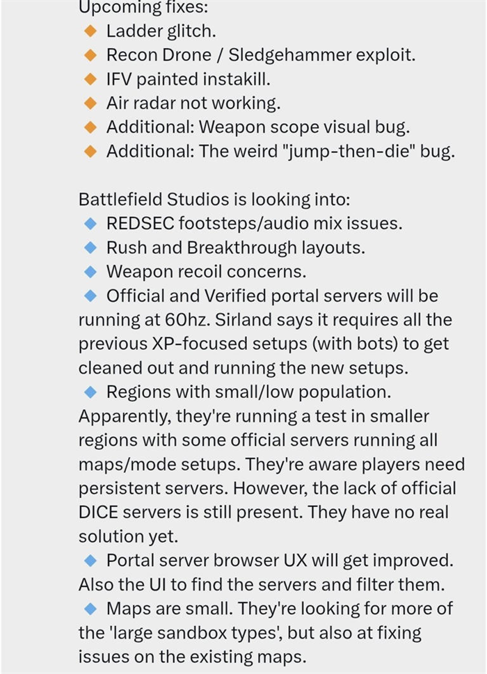 《战地风云6》披露即将上线的bug修复清单及正在推进的优化方向