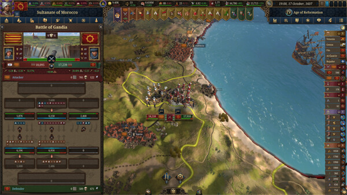 和别的游戏不一样的是,《欧陆风云5》加入了征召兵以及常备军之分,玩家可以充分扩展自己的军事武装。而在发动战役的时候,补给线、地形与气候还会共同制约战局,天时地利人和一个不能少。围攻战术与海军维护机制更给游戏增添了几分真实感,为战争增添了很多不确定性。此外还加入了联姻继承、秘密条约与宗教会议交织,同盟破裂可能引发连锁动荡,稍不注意可能就出现一招不慎满盘皆输的情况。完美诠释了帝国发展“没有永久朋友” 的法则。